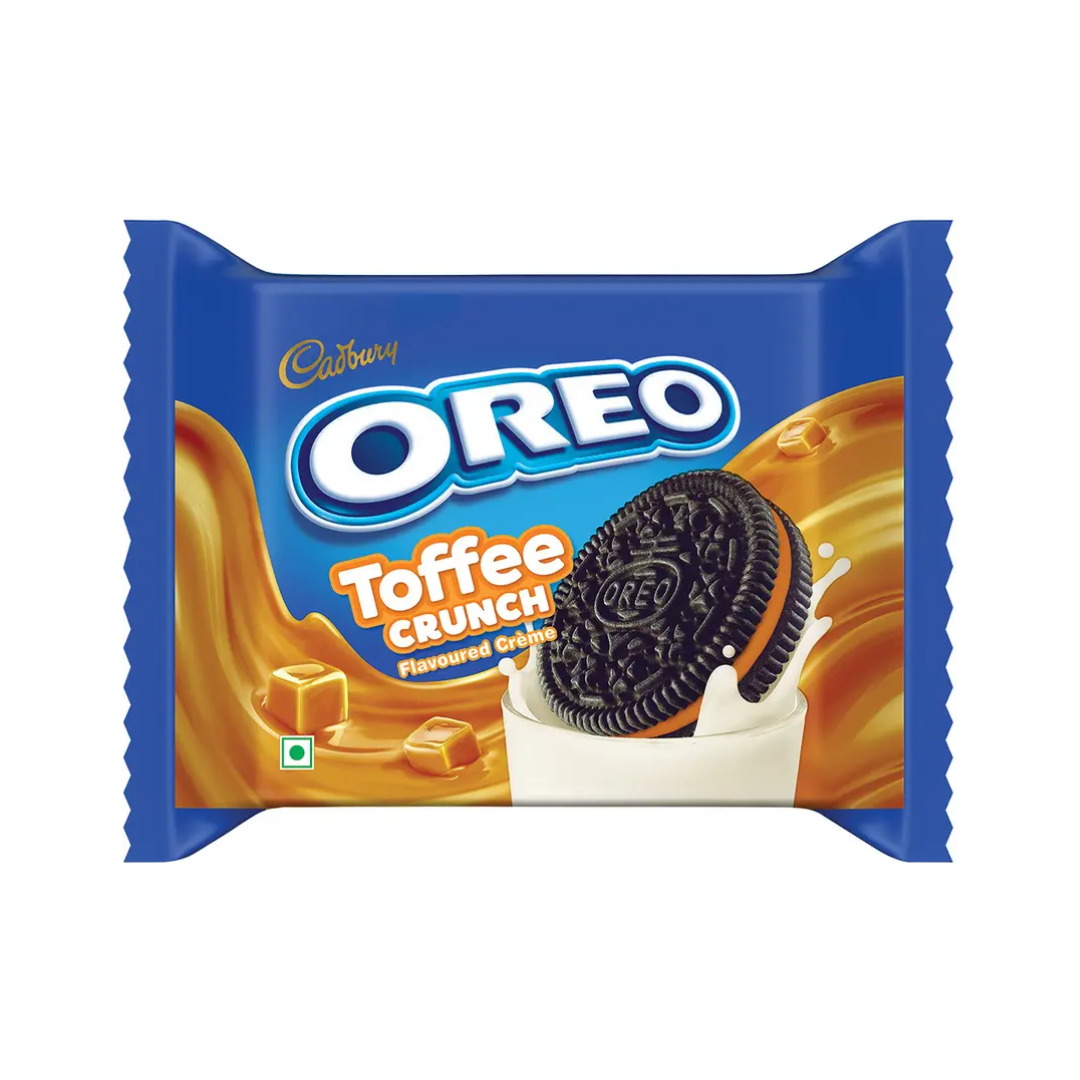 OREO: milk’s best friend for over 100 years! Cadbury OREO Toffee Crunch cr�me sandwich biscuit consists of two chocolatey biscuits with a rich toffee flavoured cr�me filling between them. Cadbury OREO cr�me biscuits are made with cocoa, which defines their unique chocolatey flavour. OREO biscuits are perfect for snacking or enjoying as a treat at any time of the day. Twist, lick and dunk! Enjoy OREO sandwich cookies with a glass of milk or add them to your favourite recipes such as cakes and milkshakes! Available in single & family packs. This biscuit pack is suitable for vegetarians.